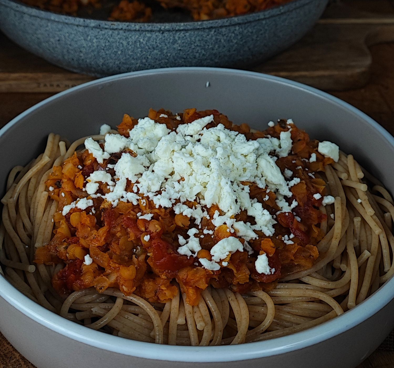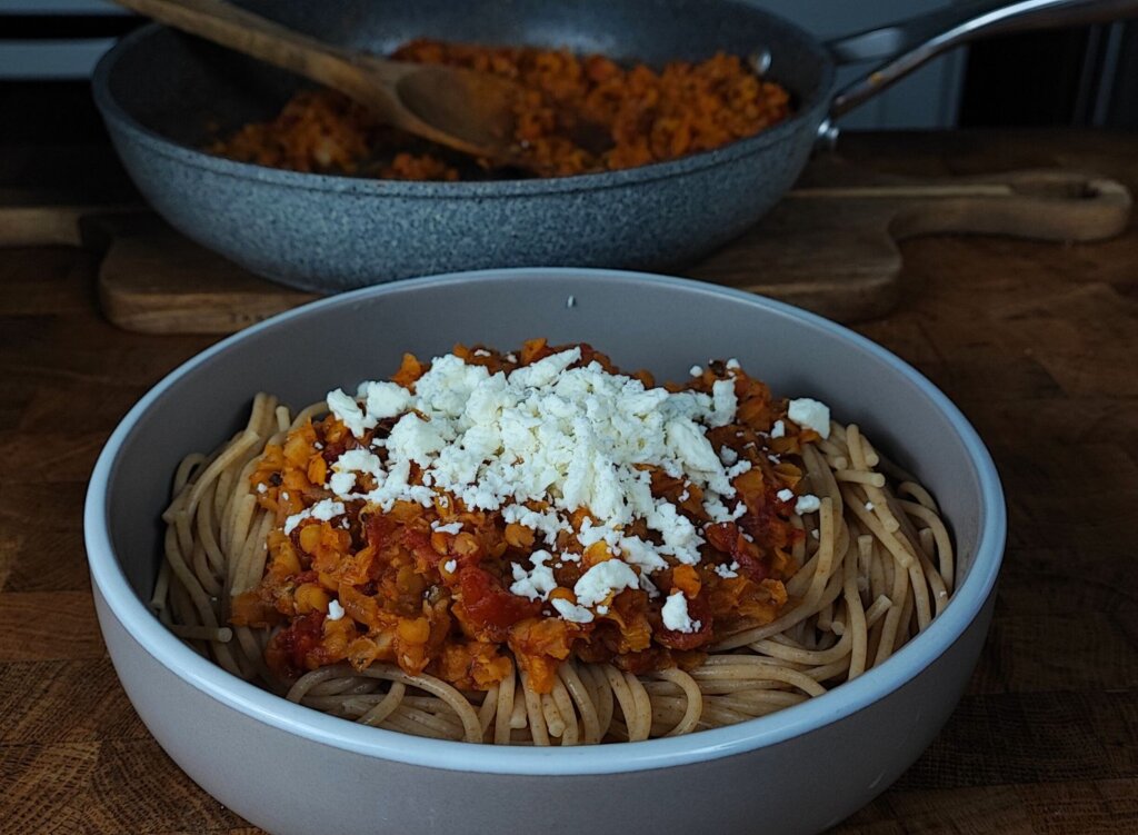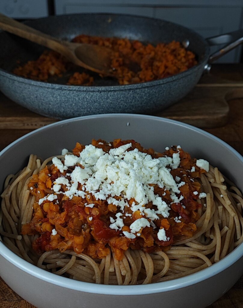 Μακαρόνια με Κιμά Κόκκινης Φακής