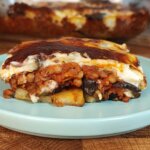 - Σε ταψάκι ρίξε το μισό μείγμα. Πασπάλισε με το μισό τριμμένο τυρί και τελείωσε με το υπόλοιπο μείγμα και το υπόλοιπο τριμμένο τυρί.