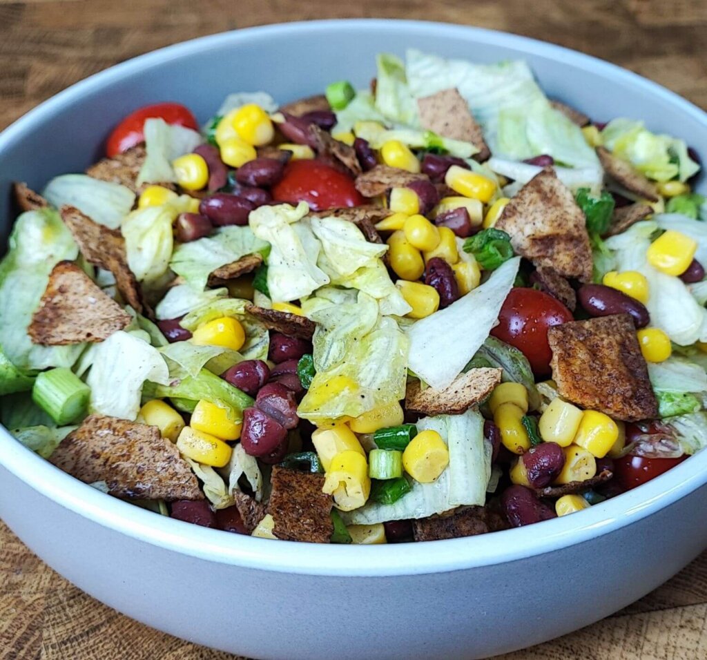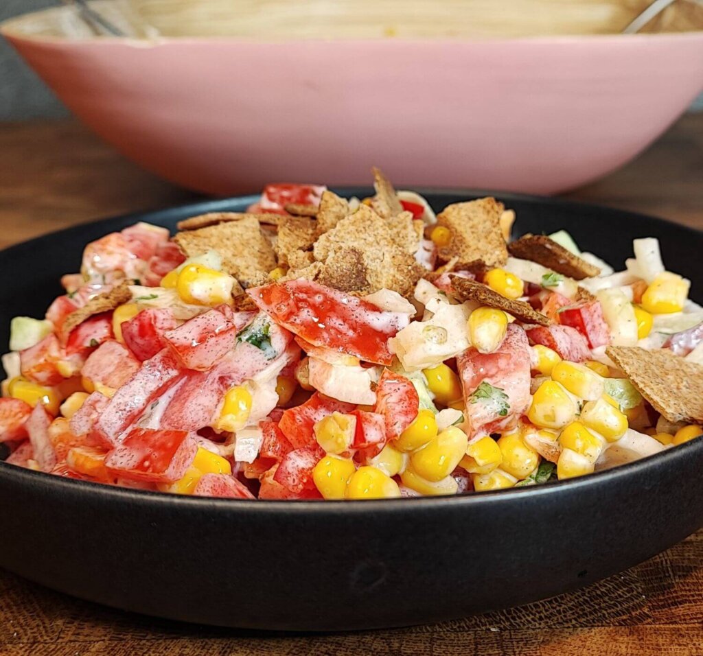 Αυτή η σαλάτα είναι έτοιμη σε 10-15 λεπτά και δεν θέλει καθόλου μαγείρεμα. Περιέχει καλαμπόκι, πιπεριές, ντοματίνια & αγγούρι για πλήρη υφή και light ενέργεια.