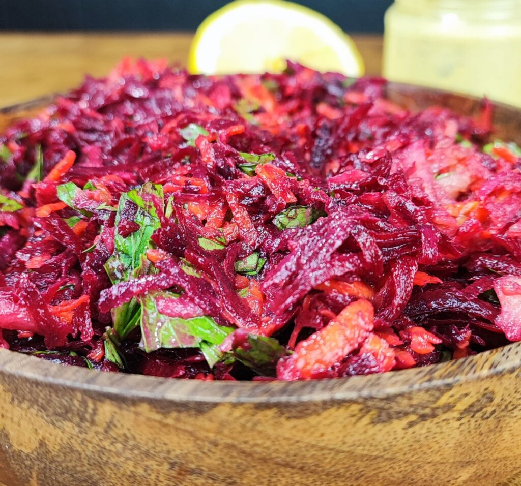 Τριμμένο παντζάρι, καρότο και μήλο με βινεγκρέτ από λεμόνι, μηλόξιδο και μουστάρδα – χωρίς μαγείρεμα, δροσερή και γεμάτη αντιοξειδωτικά, αυτή η σαλάτα θα σε ξετρελάνει.