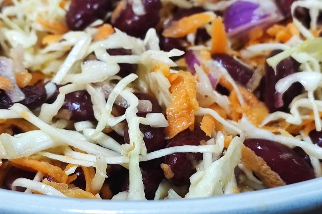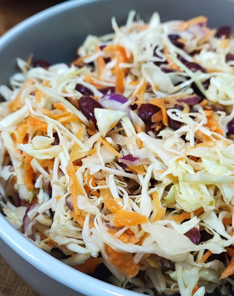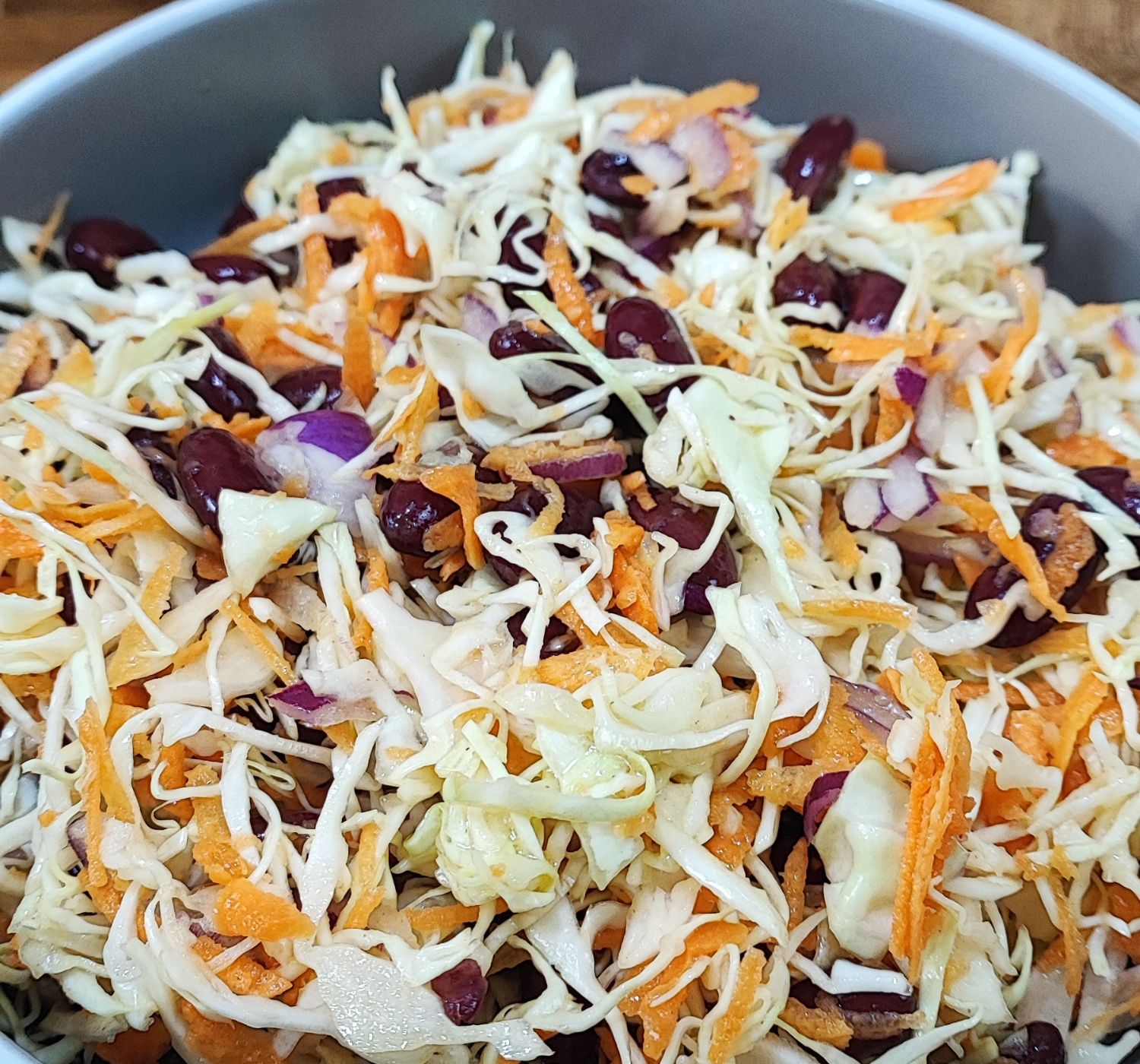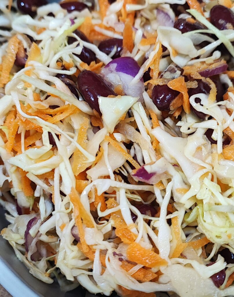 Για να το φτιάξεις και εσύ θα χρειαστείς κόκκινα φασόλια, λάχανο, καρότο, κρεμμύδι και για το dressing θα χρειαστείς ελαιόλαδο, ξίδι, αλάτι, πιπέρι, μουστάρδα και τίποτα άλλο.