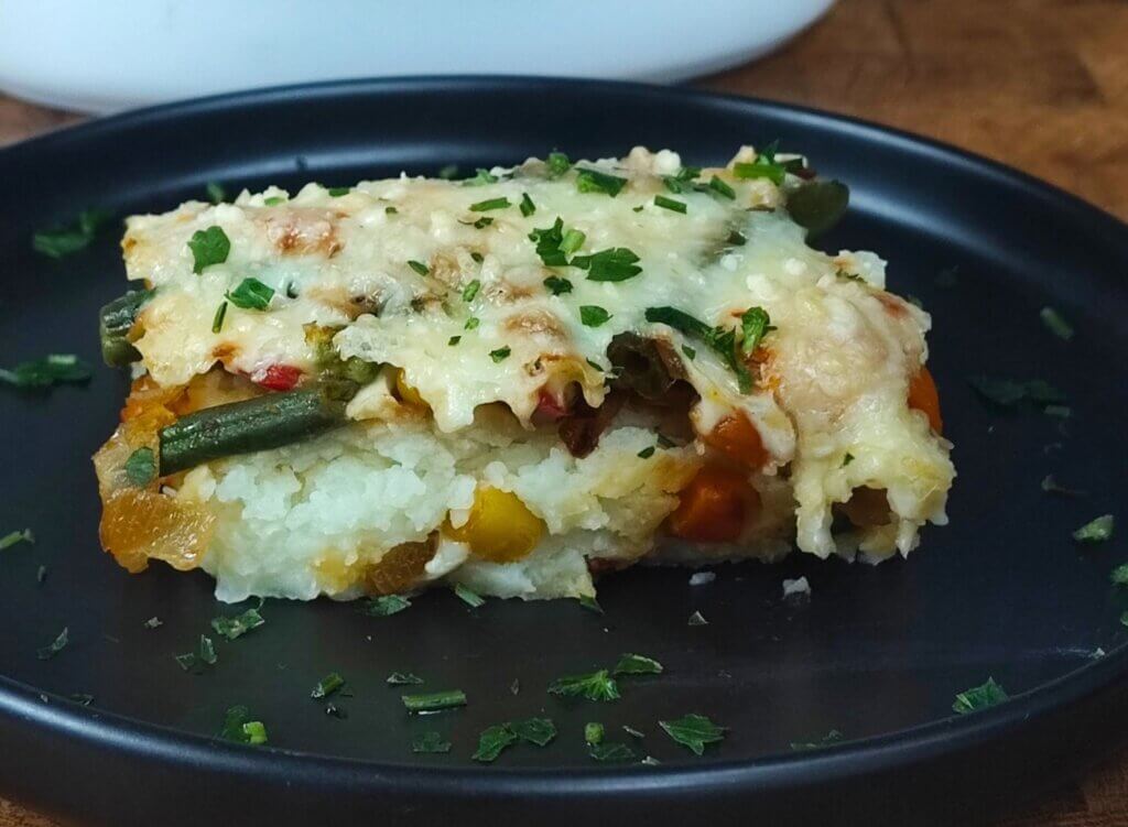 - Απλώνω τα λαχανικά πάνω στον πουρέ και ρίχνω από πάνω τριμμένο τυρί.