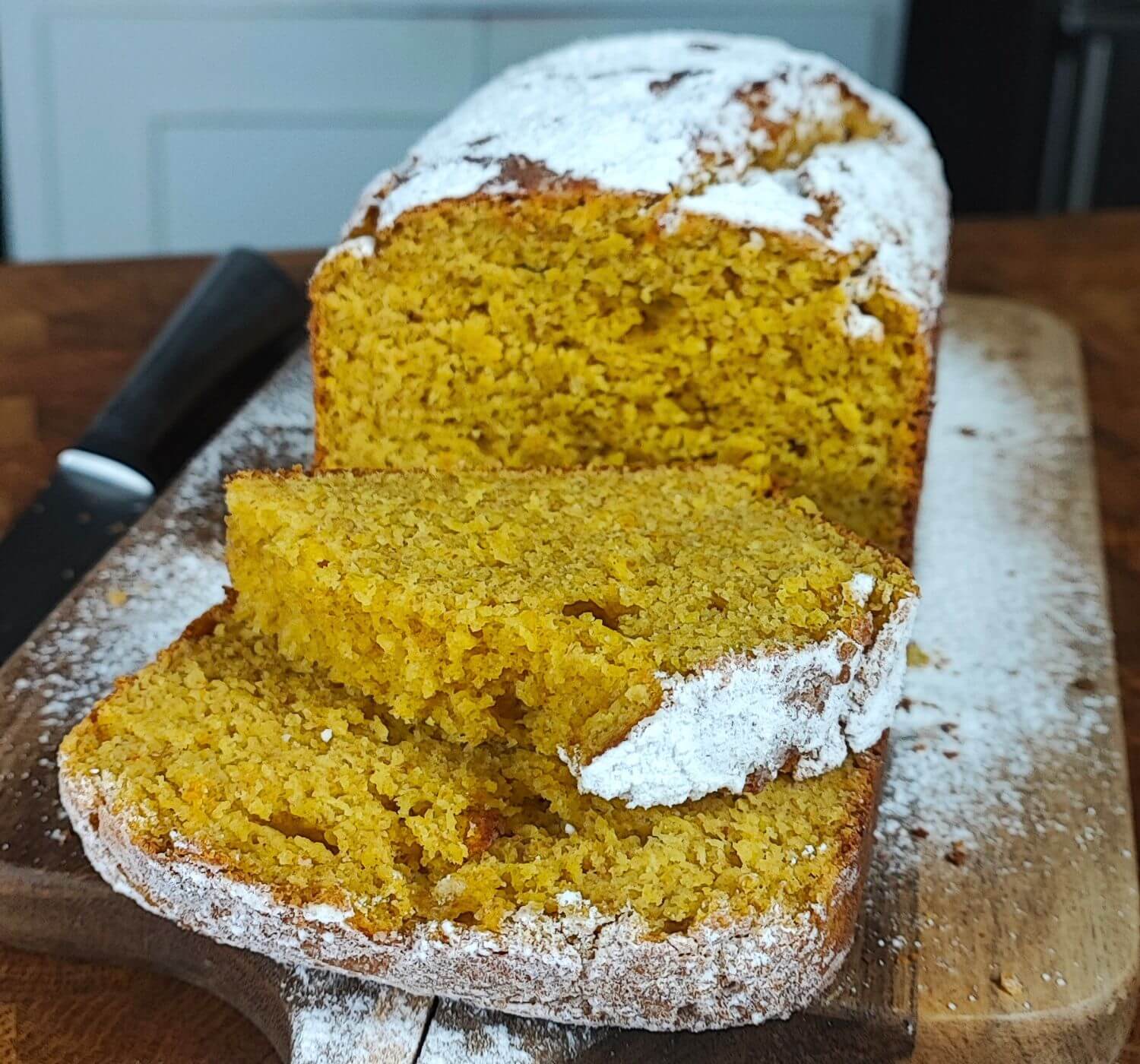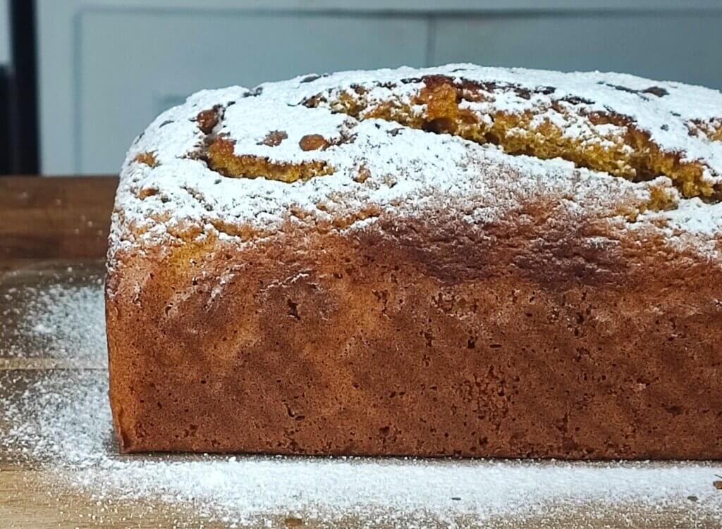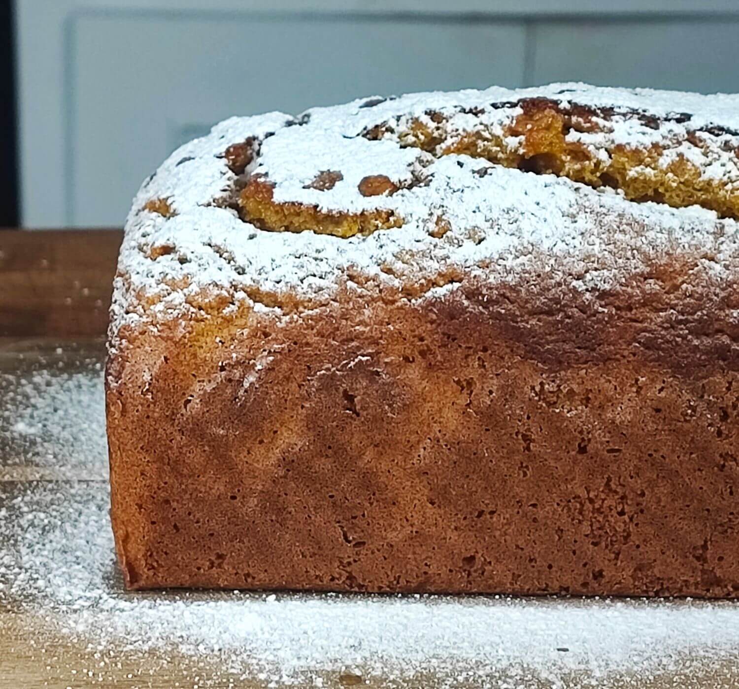 • Αφήνω να κρυώσει 10–15 λεπτά, ξεφορμάρω. Ρίχνω από πάνω λίγο χυμό πορτοκαλιού και υποκατάστατο άχνης (αν θέλω). Το κέικ είναι έτοιμο.