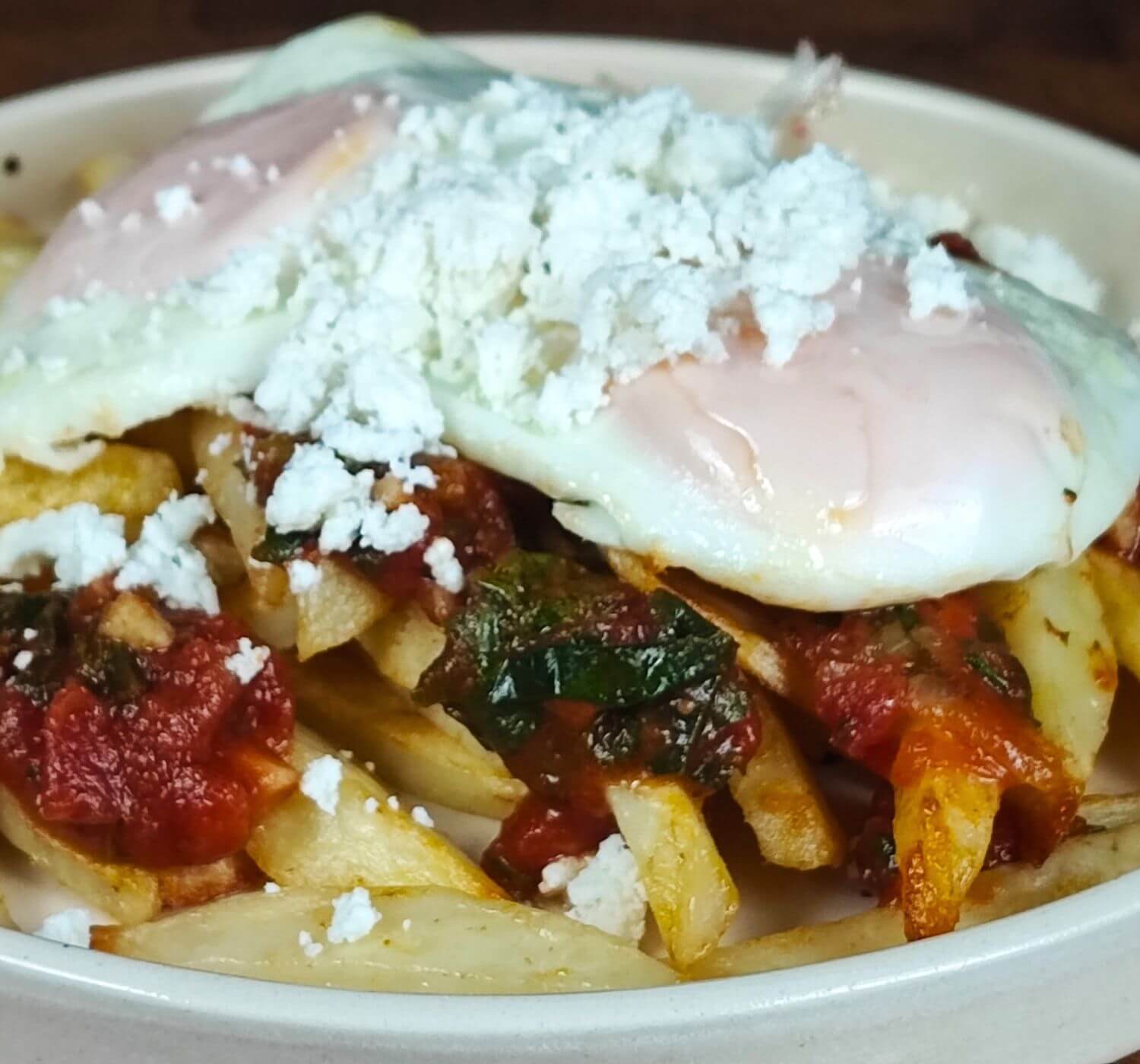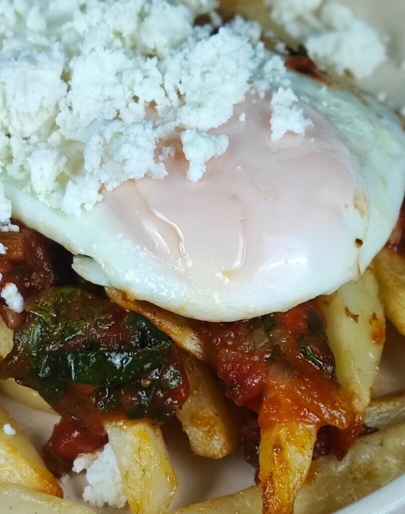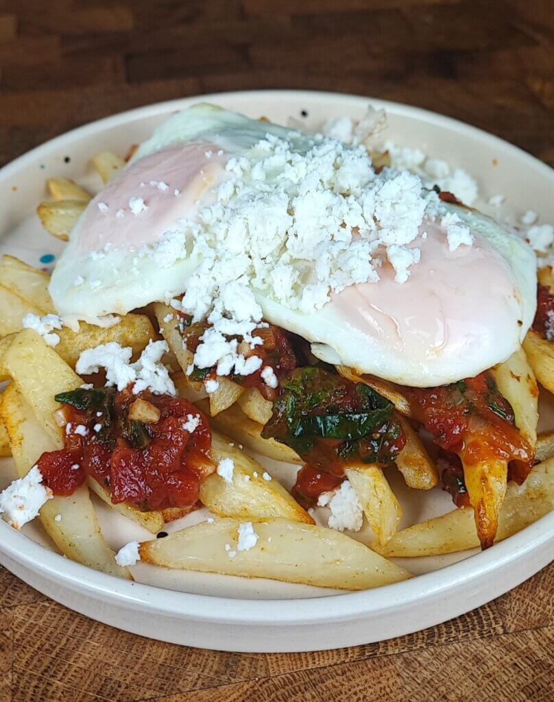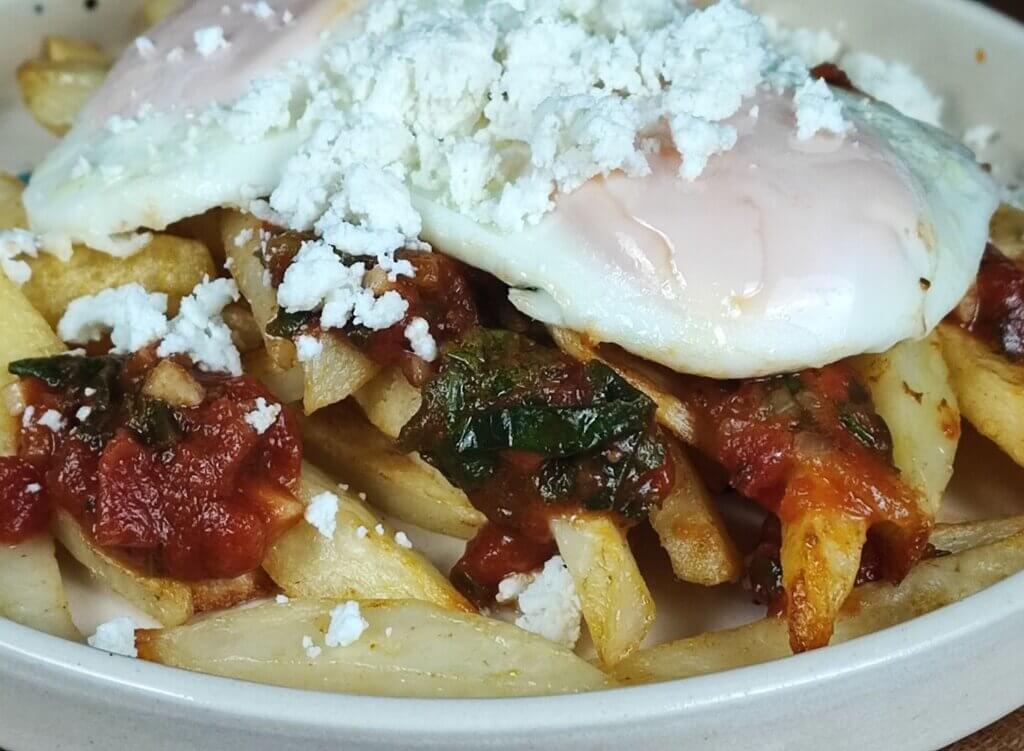- Σε πιάτο βάζω τις πατάτες, τη σάλτσα, τα αυγά και από πάνω τρίβω και μυζήθρα. Το απόλυτο comfort φαγητό είναι έτοιμο.