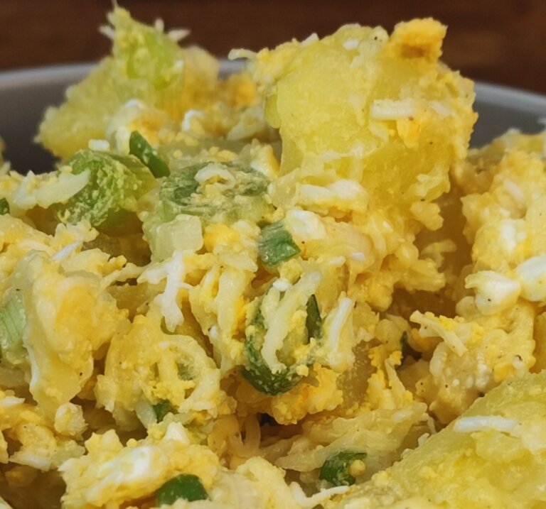 Για να την φτιάξεις και εσύ θα χρειαστείς πατάτες, αυγά, τριμμένο κίτρινο τυρί της επιλογής σου και φρέσκα κρεμμυδάκια. Όσο για το dressing θα χρειαστείς μαγιονέζα light, γιαούρτι, μουστάρδα, ξίδι, σκόρδο σε σκόνη, αλάτι και πιπέρι.