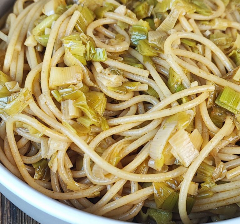 Για να τη φτιάξεις θα χρειαστείς πράσα κομμένα σε ροδέλες, σκόρδο, ξίδι, σόγια σως, λίγο μέλι ή σιρόπι αγαύης και ζυμαρικά της επιλογής σου.