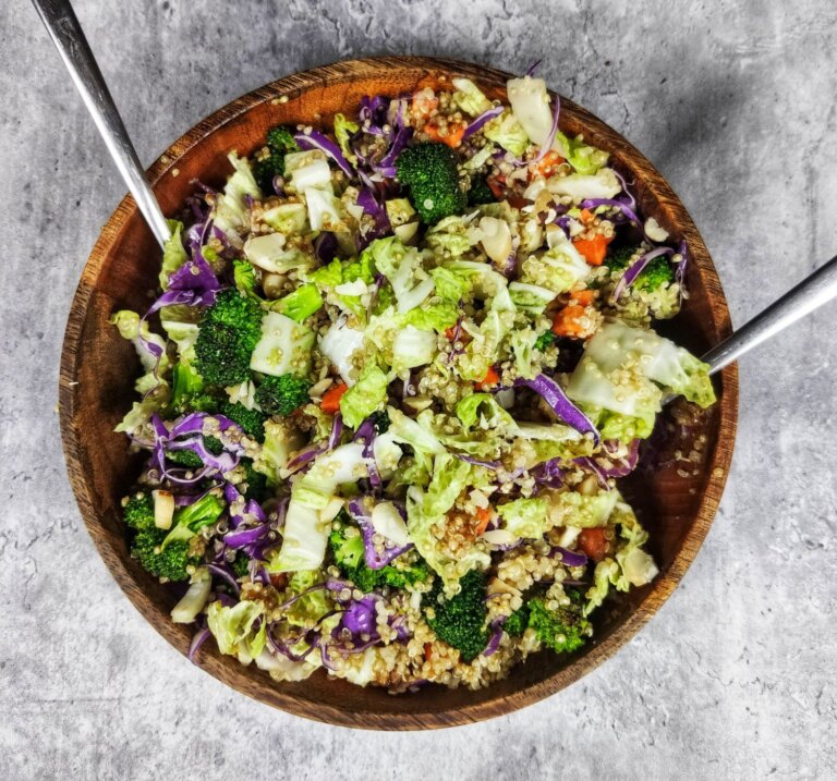 Στη δική μου αποτοξινωτική σαλάτα με κινόα έβαλα μπρόκολο, μωβ λάχανο, καρότο και κινέζικο λάχανο που αγαπώ. Είναι από τις εύκολες και χορταστικές σαλάτες που φτιάχνω κάθε εποχή του χρόνου όταν θέλω να φάω κάτι ελαφρύ, αναζωογονητικό και πολύ νόστιμο.